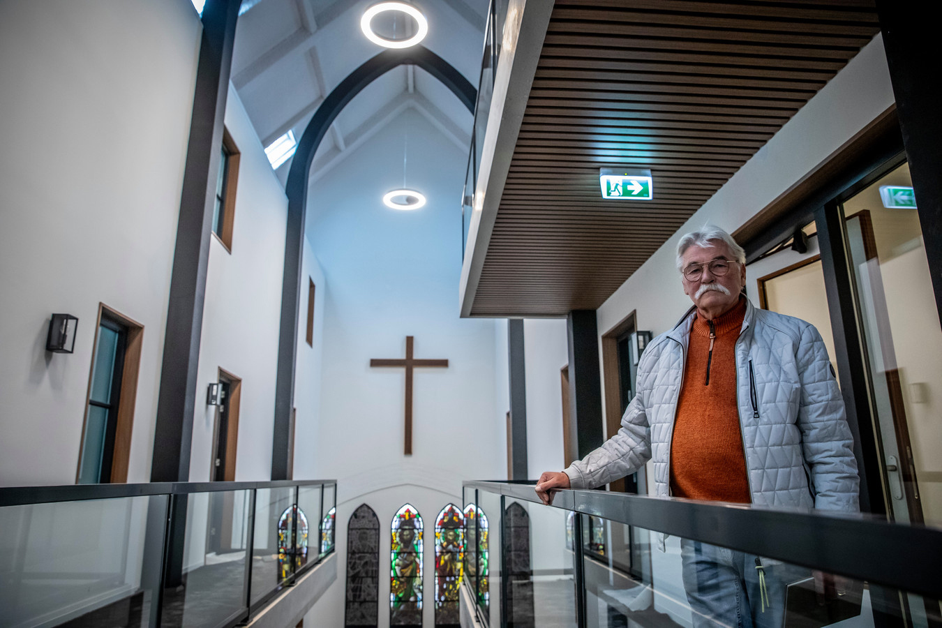 In de getransformeerde Antonius, die binnenkort officieel wordt opgeleverd, komen oud en nieuw voortdurend samen. Te beginnen in de entreehal, die toegang biedt tot de woningen. Hier leeft het verleden voort door bewust behouden elementen, van groot tot klein. Dat begint al met de metershoge doorkijk naar het dak, de donkere steunbogen eronder, een aantal glas-in-loodramen en een naastgelegen kapel: de enige publieke plek die de Antonius straks nog overhoudt. Maar het zit 'm ook in kleinere elementen: oude tegeltjes die her en der zijn teruggeplaatst, een wijwaterbakje aan de muur en een oude houten kerkdeur die na restauratie weer is teruggehangen.