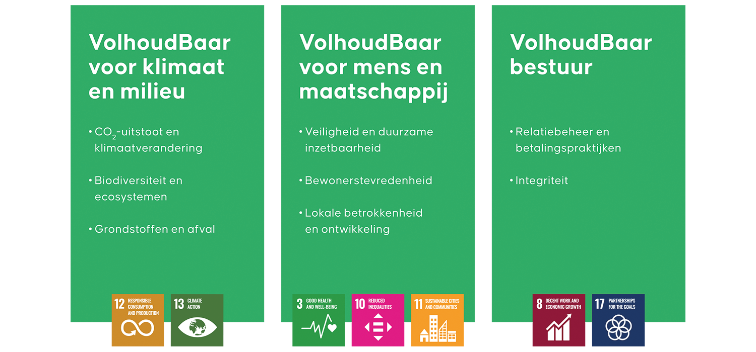 Met het VolhoudBaar-programma geven we richting aan onze duurzaamheidsambities en hoe wij onze impact op mens, milieu en goed bestuur meten en versterken. We werken volgens de ESG-principes en zorgen ervoor dat onze inspanningen transparant en aantoonbaar zijn. Daarmee nemen we verantwoordelijkheid voor de keuzes die we maken en bereiden we ons voor op toekomstige Europese rapportageverplichtingen (CSRD).